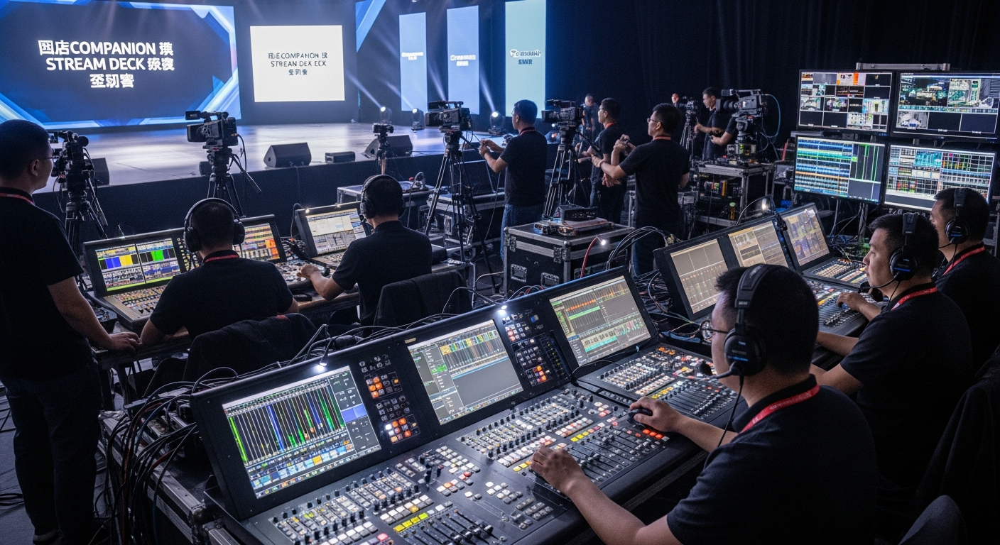 利用 Bitfocus Companion 搭配 Elgato Stream Deck 打造的自動化導播系統,核心在於透過該中介軟體將不同通訊協定(如 TCP/UDP、HTTP、OSC、MIDI、VISCA)整合至單一實體控制介面。這套解決方案能讓導播在單次按壓動作中,同步觸發導播機切換信號源、PTZ 鏡頭移動至預設位(Preset)、以及透過 DMX 介面或網路協定調整燈光數值,有效解決傳統流程中多設備操作的同步性難題,並大幅降低現場執行的人為失誤率。