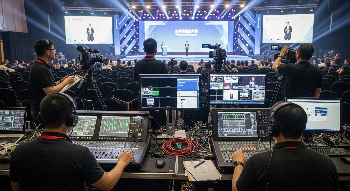 混合型活動的導播邏輯與傳統電視轉播完全不同。你必須同時管理「現場大螢幕」與「線上直播流」兩組 PGM(Program)訊號。專業工程師通常會採用的邏輯如下: